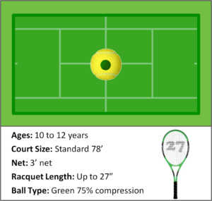 - Зеленый уровень (Stage 2, Stage Green) Заключительный уровень в подготовке юных спортсменов перед более серьезными тренировками на всей поверхности корта. Используется корт стандартной длины, и игроки могут использовать ракетки стандартной длины. Основной возраст игроков 9-10 лет. Рост ребенка от 145 см до 155 см и выше.